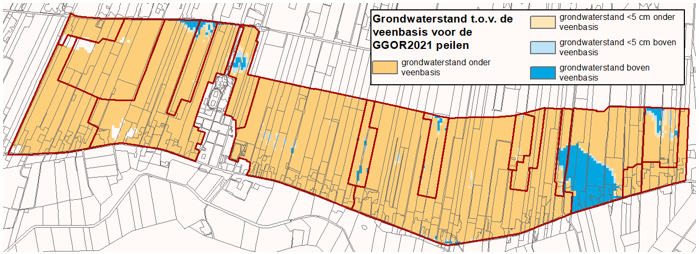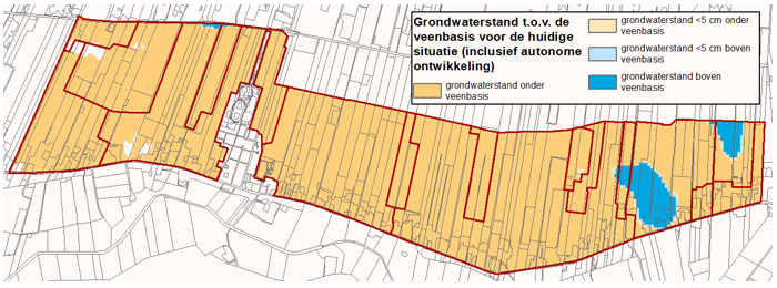 Door de hogere zomerpeilen ten opzichte van de huidige situatie en wateraanvoer is er in het grootste deel van het plangebied sprake van een verhoging van de zomergrondwaterstanden. In enkele delen van het gebied is er ook sprake van een verlaging van de GLG. Verdergaande veenoxidatie treedt op als de GLG zich in de huidige situatie in de veenlaag bevindt en na peilverlaging tot onder de veenlaag. Met behulp van berekend grondwaterstanden en de resultaten van door TNO uitgevoerde veenkarteringen zijn de grondwaterstanden ten opzichte van de diepteligging van de veenbasis in beeld gebracht.