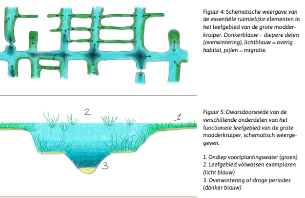 Figuur 4.3: De Grote Modderkruiper is afhankelijk van ondiep water met verlandingsvegetaties en een 10-30 cm dikke modderlaag en onderwatervegetatie. Het is oorspronkelijk een soort van laagdynamisch systeem in het rivierengebied. Essentieel is jaarrond beschikbaar zijn van water. Diepere plekken waar in drogere periodes alsook in de winter naar uitgeweken kan (zie bijgaande afbeelding). De soort is relatief honkvast en heeft een gering dispersievermogen van 1 tot 3 km (Kennisdocument BIJ12, 2021).