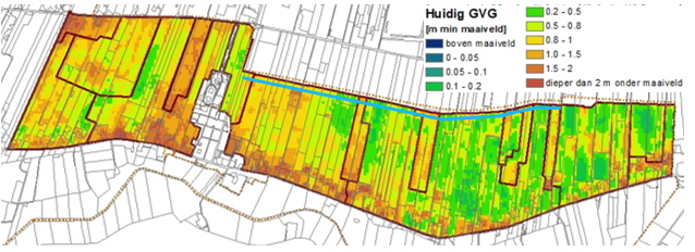 De huidige GVG (zie Figuur 2 6) geeft een vergelijkbaar beeld. De diepste grondwaterstanden bevinden zich in het westen van het gebied. De GVG bevindt zich in het oosten van het gebied tussen de 0,2 en 0,5 m-mv. In het westen ligt de GVG grofweg tussen de 0,5 en 1 m-mv.