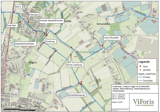 Figuur 1 Topografie en legger Waterschap Limburg ter hoogte van Hasselderheide