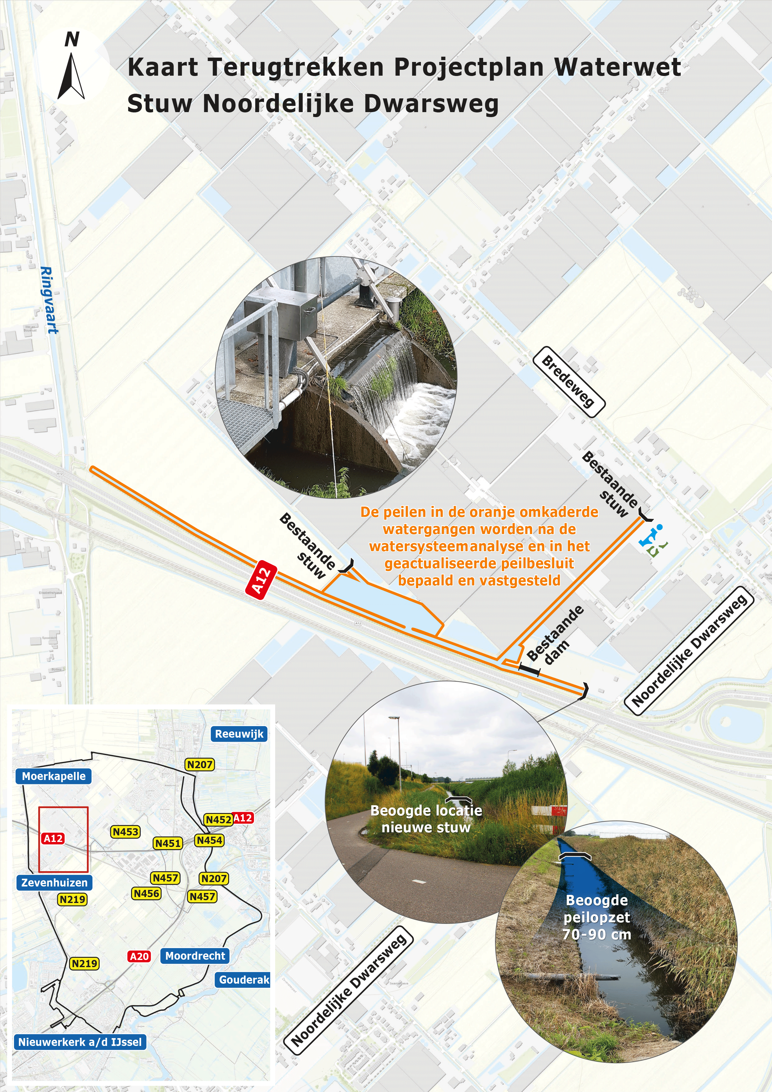 Begin 2023 ontvingen belanghebbenden in de omgeving een brief over de inspraak bij de voorgenomen bouw van een nieuwe flexibel instelbare stuw (Noordelijke Dwarsweg bij de A12 - zie kaart). Voor de bouw van de stuw is een Projectplan Waterwet opgesteld dat tot 2 maart 2023 ter inzage heeft gelegen. Daarop zijn meerdere inspraakreacties binnengekomen die aanleiding waren voor gesprekken met de indieners.