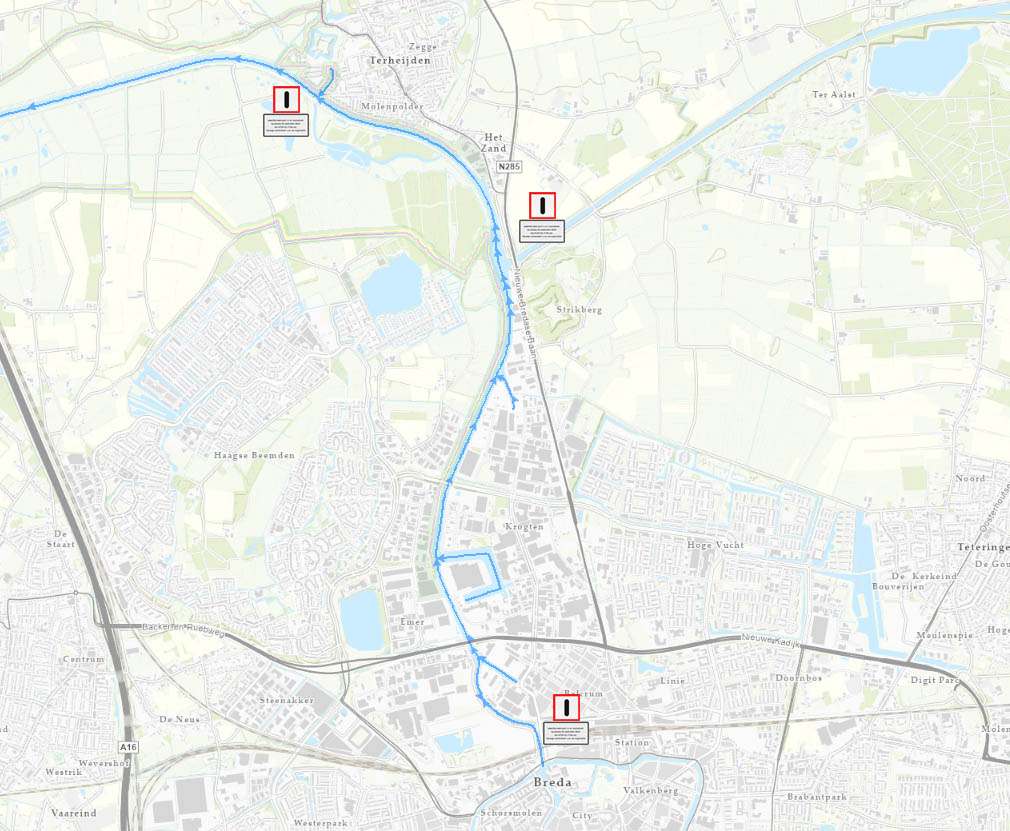 Het dagelijks bestuur van waterschap Brabantse Delta besluit om gedurende het evenement tijdelijk Verkeerstekens B.8 met onderbord F3 “beperkte doorvaart i.v.m. evenement op zaterdag 7 oktober 2023 tussen 09:00 en 16.00 uur. Passage uitsluitend i.o.m. de organisatie” aan te laten brengen langs De Mark zoals hieronder aangegeven: