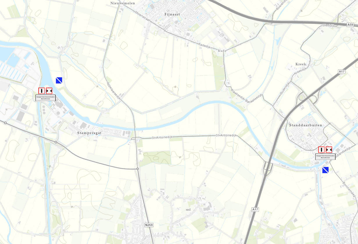 Het dagelijks bestuur van waterschap Brabantse Delta besluit om gedurende de werkzaamheden tijdelijk Verkeerstekens B.8, C3 (met onderbord F3 “(Bagger)werkzaamheden Mark/Dintel”) en E.11 aan te brengen zoals hieronder aangegeven: