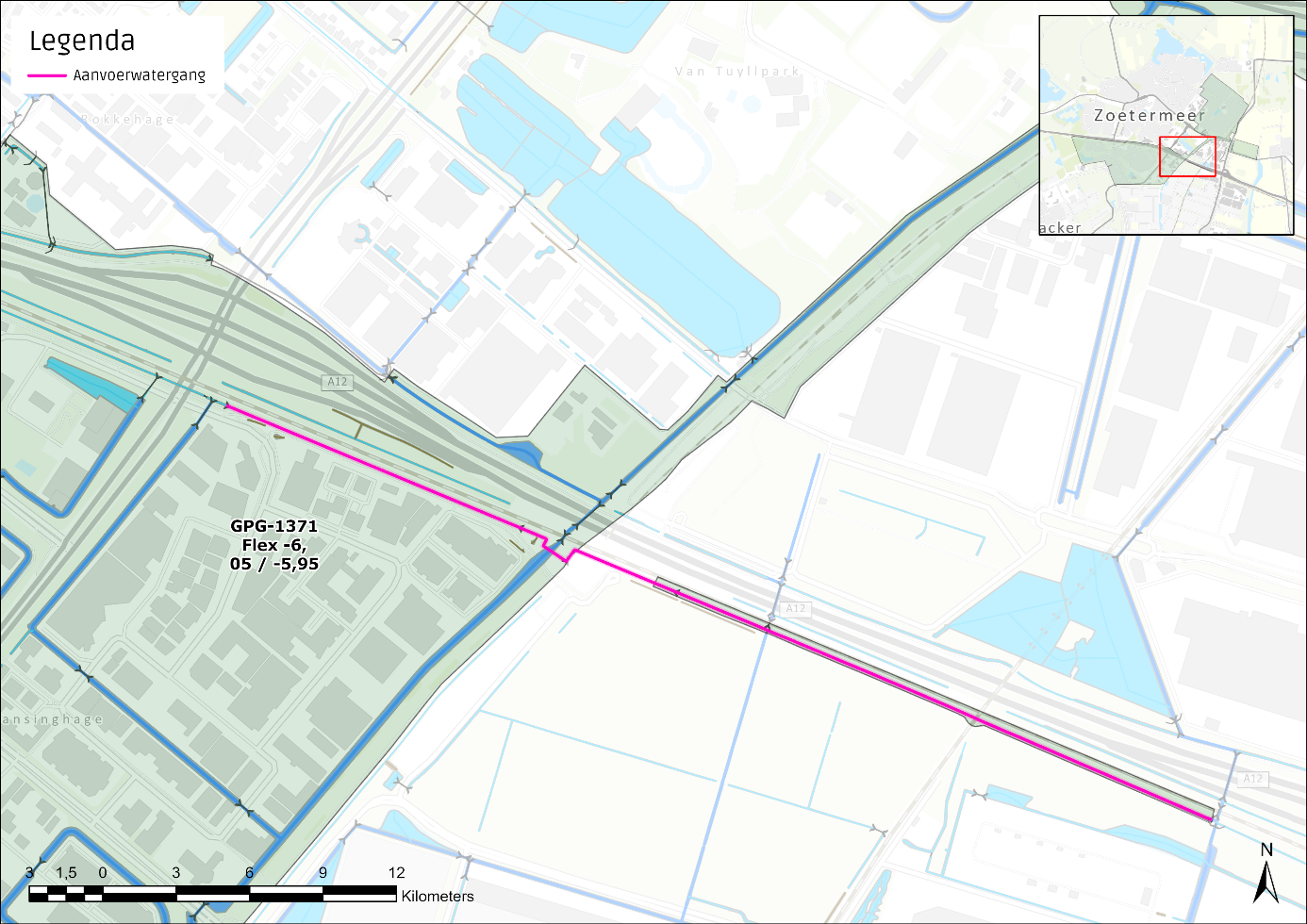 Deze bermsloot gelegen tussen het fietspad langs de A12 en de Waterzuiveringsweg voert hemelwater van het fietspad en naastgelegen terreinen af naar peilgebied GPG-1371 (-6,05/-5,95 m NAP) via een vaste stuw met een overstorthoogte van -5,53 m NAP. In verband met de maaiveldhoogte is het peil gerechtvaardigd. Zie figuur 14.