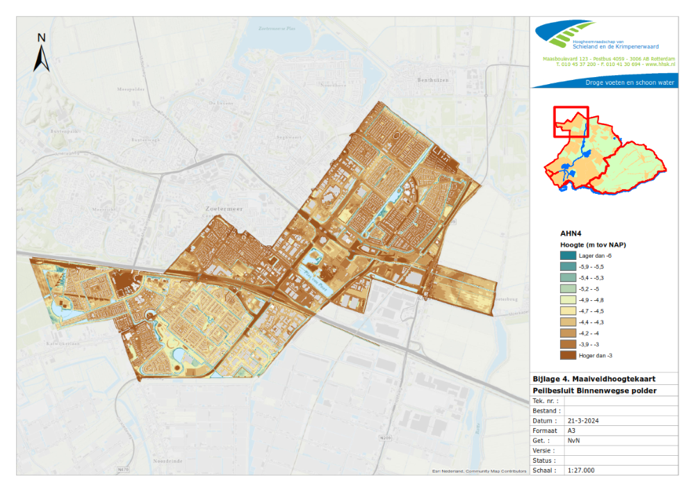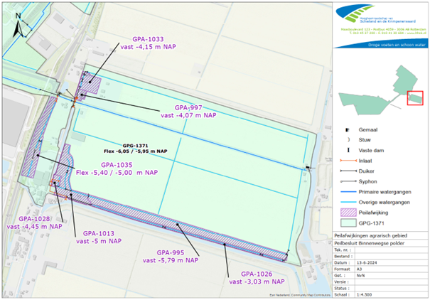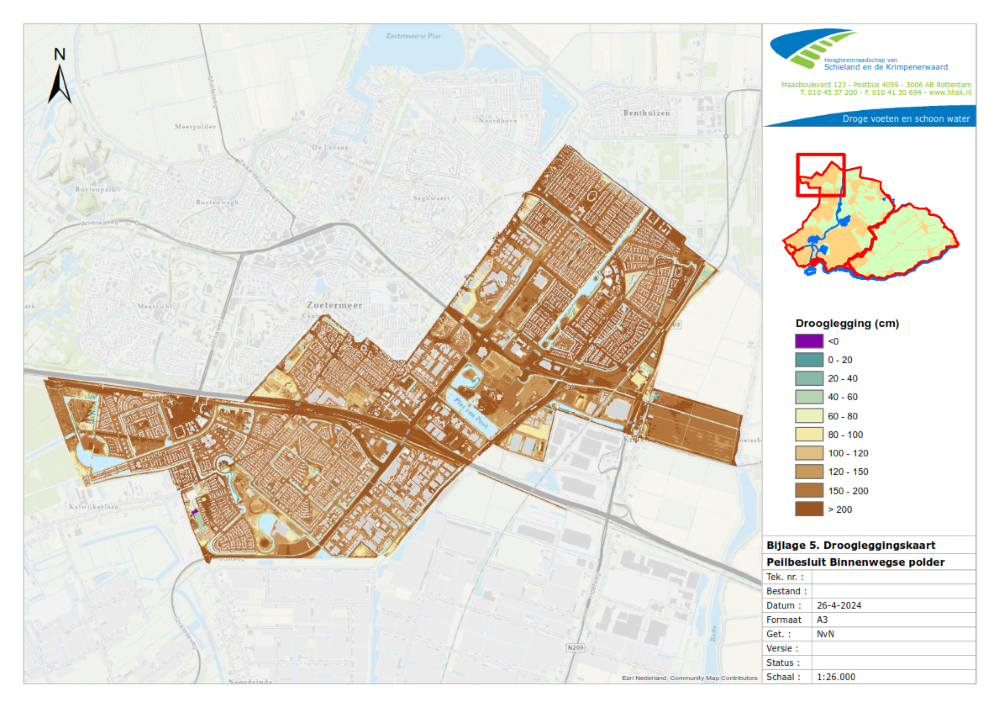 De drooglegging in de Binnenwegse polder (op basis van de schouwpeilen van peilgebieden en peilafwijkingen uit het nieuwe peilbesluit) is op kaart weergegeven in bijlage 5.3
