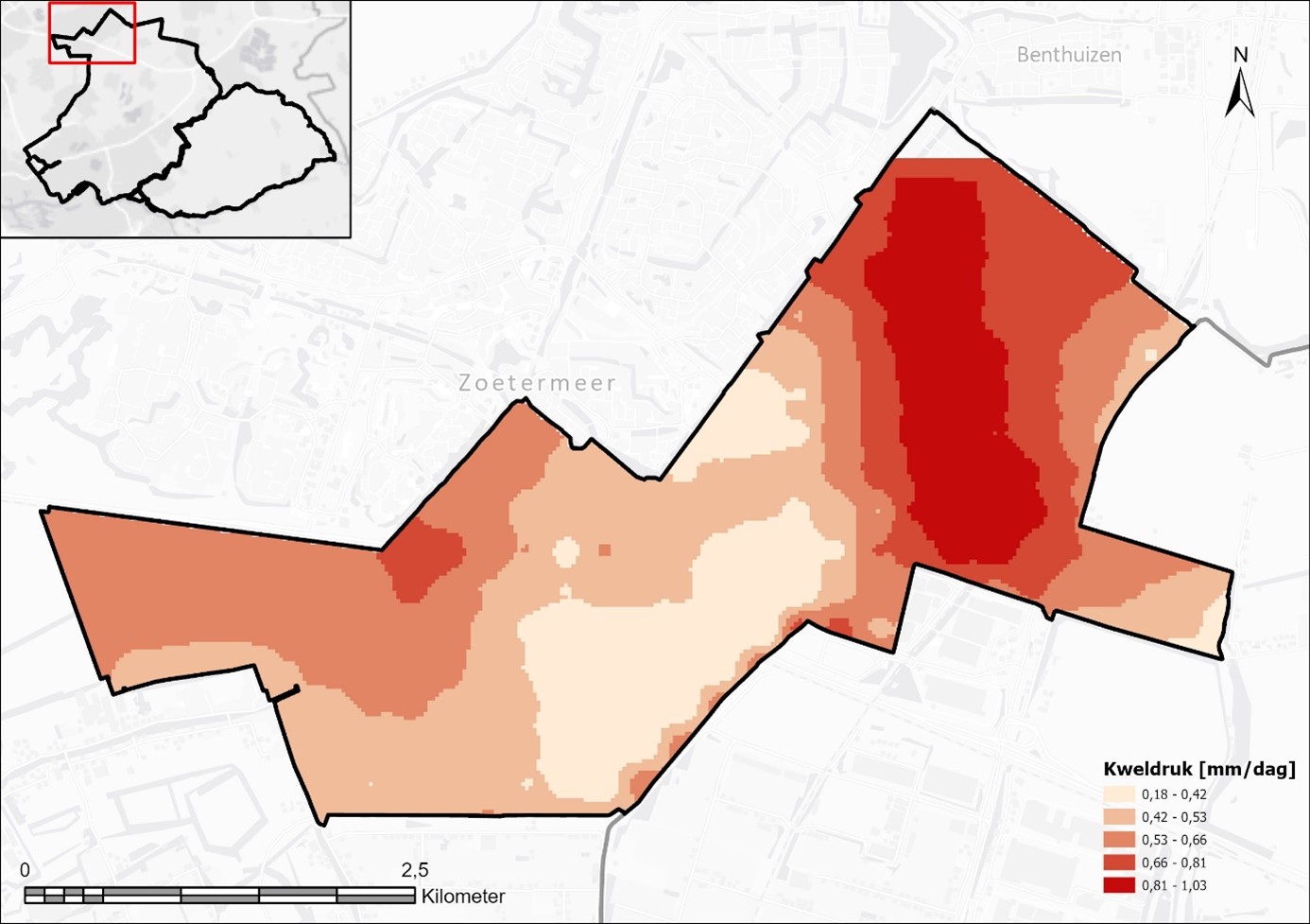In het gebied komt kwel – omhoog tredend grondwater – voor, zie figuur 2. Van wegzijging is geen sprake. De kweldruk varieert tussen de 0 en 1 mm per dag. In het oostelijke deel van het gebied is de kweldruk hoger. Het zuidelijke deel van het gebied kent de laagste waarden. De kweldruk is tevens afhankelijk van het seizoen, waarbij de hoogste waarden in de zomer voorkomen.