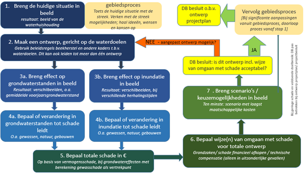 Bij elk project t.b.v. herinrichting van het watersysteem waarbij een waterhuishoudkundig effect buiten het profiel van de watergang (verandering van inundatie en/ of grondwaterstand) verwacht wordt, wordt een aantal stappen doorlopen voorafgaand aan het daadwerkelijk opstellen van het projectbesluit. De conclusie van deze stappen wordt ter besluitvorming voorgelegd aan het dagelijks bestuur, in die gevallen dat het niet mogelijk is om met beperkte schade (mede in relatie tot de verwachte totale investering binnen de normkosten) aan de waterdoelen te voldoen. Zonodig worden in deze ontwerpfase scenario’s voorgelegd. Daarmee krijgt het bestuur inzicht in resultaten, risico’s, kosten en effecten van de herinrichting, op basis waarvan keuzes kunnen worden gemaakt voor het vervolg.
