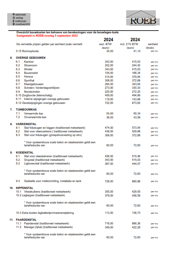 Voor het plaatsen van bouwwerken of kunstwerken waterstaatswerken en beschermingszones wordt een bedrag aan leges in rekening gebracht dat afhankelijk is van de aanleg-, bouw- of sloopkosten. Voor het afhandelen van deze aanvragen wordt naast het basistarief van € 325,00 een toeslag berekend op basis van een percentage van de aanleg-, bouw- of sloopkosten van 3,4%. Om te voorkomen dat de legeskosten onevenredig hoog worden, is een plafond van € 100.000,- ingebouwd. Dit bedrag is vastgesteld op de vooronderstelling dat ook de kosten van vergunningverlening voor de grootste projecten met dit bedrag zullen worden gedekt.