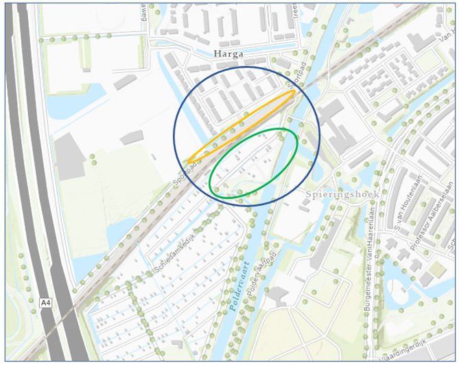 Het gebied waar dit nieuwe peilvoorstel voor geldt bevindt zich aan de westzijde van gemeente Schiedam, ten westen van de Poldervaart en ter hoogte van de Sportpad (Figuur 1). In het gebied bevinden zich het Sportpad en ten zuiden hiervan een spoorbaan van de metro (geel omcirkeld). Ten zuiden van de spoorbaan liggen volkstuinen (groen omcirkeld). De bodem in het gebied bestaat vooral uit klei en veen en is daarom matig zakkingsgevoelig. Volgens de cultuurhistorische atlas van de provincie Zuid-Holland is de archeologische waarde in dit gebied ‘hoog’ in de bovenste 0 tot 3 meter vanwege de aanwezige historische zee-afzettingen met een hoge kans op voorkomen van archeologische resten.