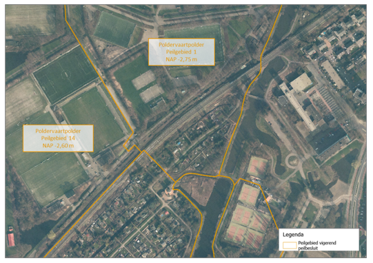 De peilen van peilgebied 1 en 14 zijn in 2012 vastgesteld in het peilbesluit ‘Poldervaartpolder’. Het peil van peilgebied 1 is vastgesteld op een vast peil van NAP -2,75 m en het peil van peilgebied 14 is vastgesteld op een vast peil van NAP -2,60 m. Dit is weergegeven in Figuur 2.
