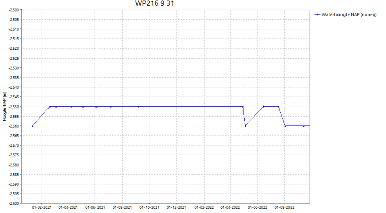 Figuur 4 laat de meetgegevens zien van het peil van peilgebied 14 bovenstrooms bij stuw 216408, ten noorden van het Sportpad. Aan deze metingen is te zien dat het peil van peilgebied 1 binnen de beheermarge van het peil wordt gehouden.
