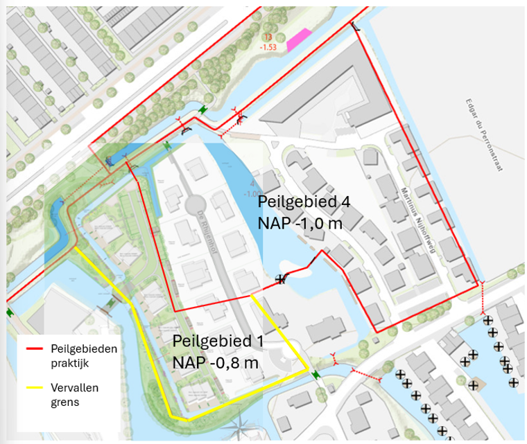 Deze peilafweging heeft betrekking op het gedeelte ten westen van de Rhijenhof van peilgebied 1 wat door de ruimtelijke ontwikkeling De Parel is gewijzigd.