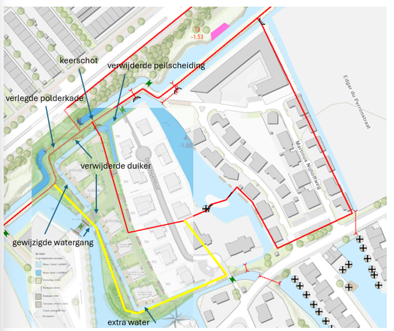 Vervolgens zijn op basis van vergunning 2020-01198 nog meer wijzigingen aangebracht in het watersysteem. De watergang aan de westzijde is in tweeën gedeeld (noord en zuid van de brug) en deels verplaatst. De duiker in de watergang is aan de westzijde is verwijderd. Deze watergang is deels verlegd en deels opnieuw geprofileerd en in open verbinding gebracht met peilgebied 1. Aan de noordzijde is in de westelijke watergang een duiker verwijderd en vervangen door open water. Aan de noordzijde is in de westelijke watergang een keerschot geplaatst om de peilscheiding te realiseren met het oostelijke deel. De polderkade is verlegd waardoor de peilgebiedsgrens aangepast is. Deze wijzigingen resulteren in een gewijzigde begrenzing van peilgebied 4 en peilgebied 1.