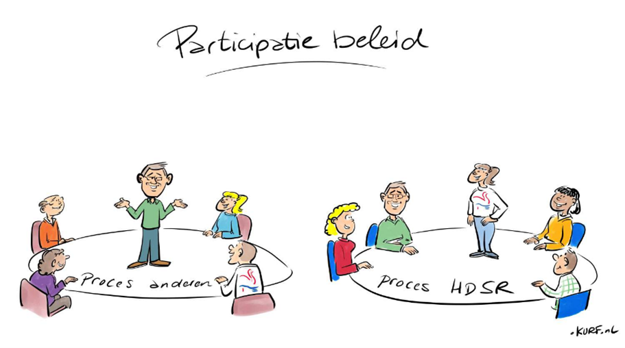 Tot slot is participatie ook een belangrijke pijler van de Omgevingswet. Voor bepaalde instrumenten van het waterschap geldt een motiveringsplicht voor het participatieproces. En overheden zijn verplicht om een participatiebeleid en -verordening te hebben en daaraan uitvoering te geven. HDSR had nog geen participatiebeleid, maar we organiseren al wel veel participatie, dus de uitgangspunten en werkwijzen zijn niet nieuw.
