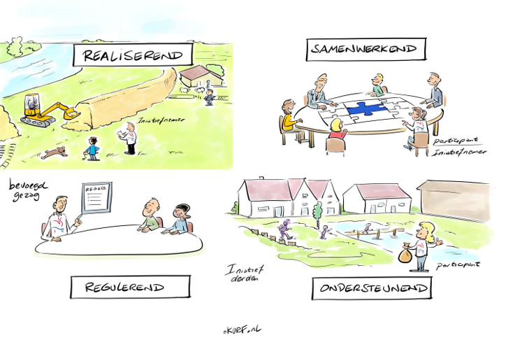 Voor het waterschap zijn vier sturingsvormen mogelijk, die de rol ten aanzien van participatie op hoofdlijnen bepalen. De aard van de sturing door het waterschap bepaalt voor een groot deel of het waterschap initiatiefnemer, participant of bevoegd gezag is in de participatie. Deze sturingsvormen bestaan naast elkaar en tegelijkertijd – de ene is niet beter dan de andere en het model beoogt geen transitie. Traditioneel zijn de waterschappen (uitvoeringsorganisaties) goed toegerust op realiseren en reguleren. En samenwerken en ondersteunen zijn al jaren volop in ontwikkeling. De huidige maatschappelijke opgaven vragen om een mix van de sturingsvormen en het schakelen daartussen.