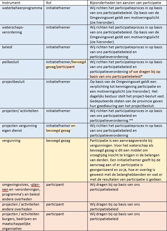 Vanuit de Omgevingswet zijn voor drie instrumenten specifieke eisen aan participatie gesteld: voor de waterschapsverordening, het waterbeheerprogramma en projectbesluiten. Voor alle drie geldt een motiveringsplicht (achteraf) hoe invulling is gegeven aan de participatie en wat er met de resultaten is gedaan. En voor het projectbesluit geldt daarnaast ook een verplichting tot kennisgeving van participatie vooraf, om belanghebbenden in de gelegenheid te stellen om te participeren.