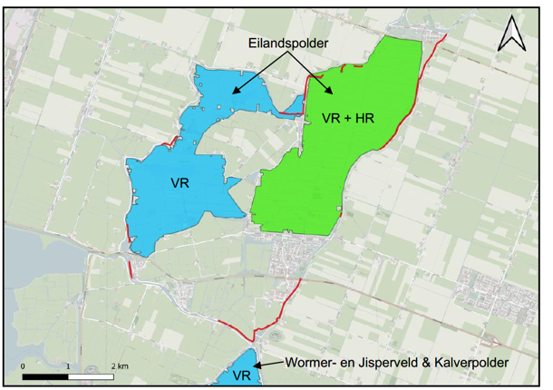 De dijken van de dijkring Eilandspolder die niet voldoen aan de wettelijke waterveiligheidseisen zijn weergegeven in figuur 7. Het projectgebied bestaat uit afwisselend stedelijke gebieden (m.n. West-Grafdijk; Driehuizen; Grootschermer; Schermerhorn en De Rijp) en landelijke gebieden.