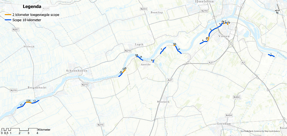 Waterschap Rivierenland werkt de komende jaren aan de Lekdijk. Van de 40 kilometer dijk voldoet 34 kilometer niet aan de waterveiligheidsnormen die sinds 2017 gelden. Van dit traject versterken wij vóór 2030 een aantal dijkvakken, circa 12 kilometer in totaal. Dit zijn de blauw + oranje aangegeven gedeelten in onderstaand kaartbeeld. Dit noemen we de geografische scope van SAFE. Uiterlijk in 2050 moet de hele dijk voldoen aan de (wettelijke) norm. Daarvoor dienen ook de resterende delen van de dijktrajecten (naar verwachting nog ca 22 km) in de toekomst te worden versterkt.