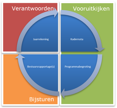 Onderstaande grafiek geeft weer de verschillende instrumenten die worden ingezet voor vooruitkijken, bijsturen en verantwoorden van reserves en voorzieningen.