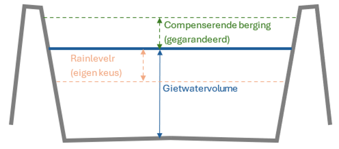 Indien gekozen wordt voor realisatie van waterberging in een gietwatervoorziening, dan ontstaan er ruimtelijk gezien twee principieel verschillende waterschijven in een bassin: één voor waterberging, zijnde de compensatie die nodig is voor de toegenomen verharding en één voor gietwater, beschikbaar voor gebruik in de kas. De uitgangspunten van de Groenlabelkas geven handvatten voor het benodigde gietwatervolume voor een bepaalde gietwaterdekking met hemelwater, en deze waterschijf mag altijd vol staan.