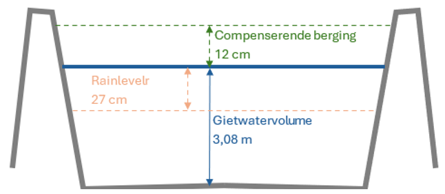 Fictief rekenvoorbeeld, om een indruk te geven van de verhouding tussen de volumes voor gietwateropslag, compenserende berging en Rainlevelr