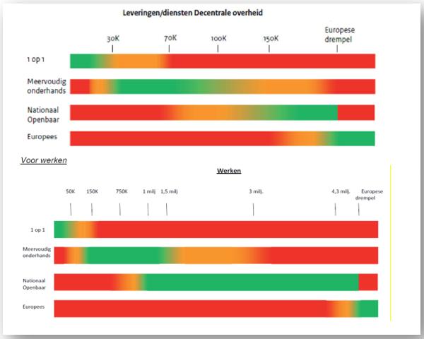 De Gids Proportionaliteit heeft bij Voorschrift 3.4a een schema opgenomen. Het waterschap hanteert het volgende (kleuren)schema, voor het bepalen van inkoopprocedures: