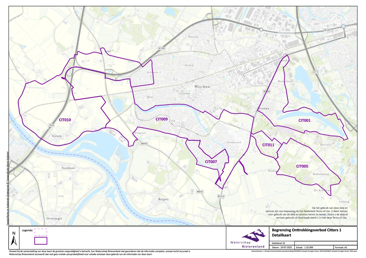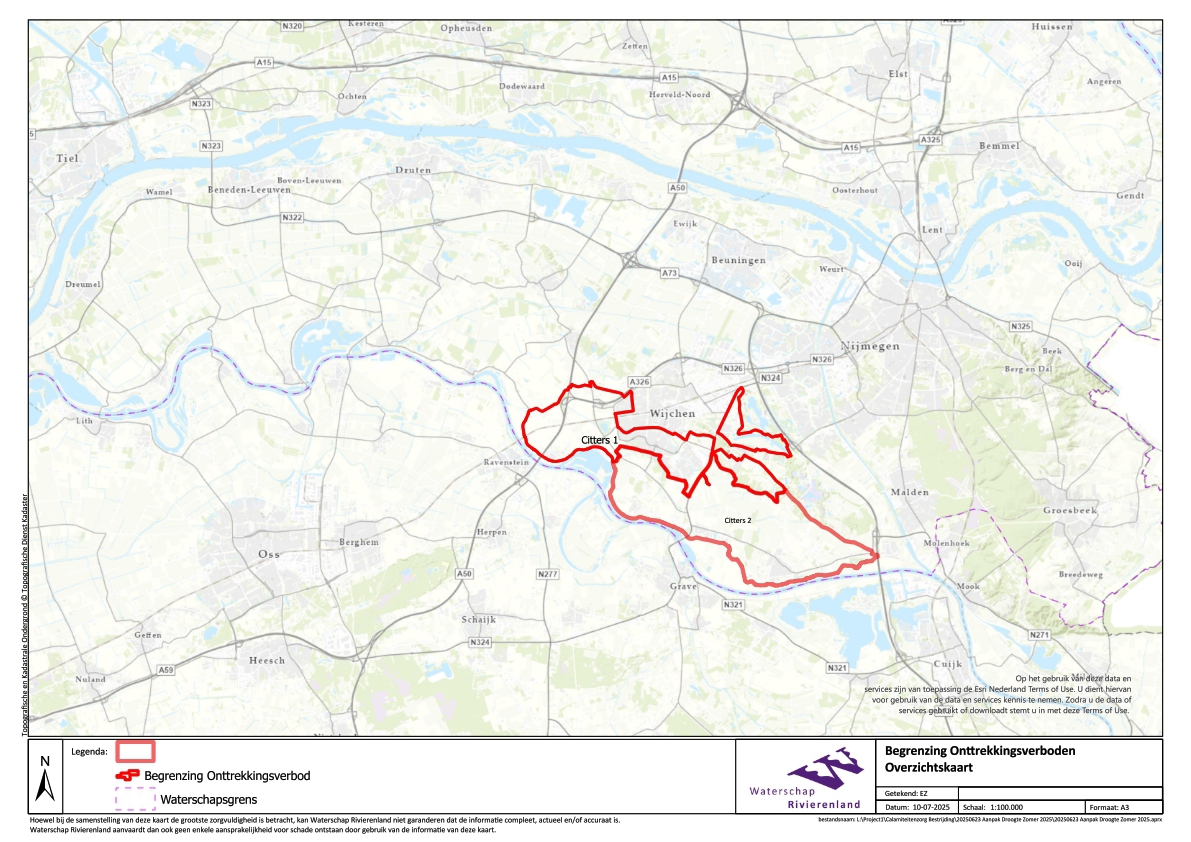 Met ingang van 11 juli 2025 tot een nader te bepalen tijdstip een verbod in te stellen voor het onttrekken van oppervlaktewater voor de volgende peilgebieden van Waterschap Rivierenland (zie bijgevoegde kaartjes): CIT 001, CIT 005, CIT 007, CIT 009, CIT 010 en CIT 011 (Citters I).