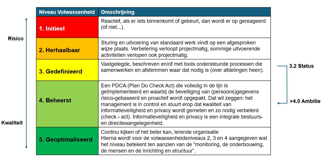 Op 15 mei 2020 heeft de Commissie Bestuurszaken, Communicatie en Financiën (CBCF) van de Unie van Waterschappen besloten de ambitie van het volwassenheidsniveau voor privacy voor alle waterschappen vast te stellen op 4. Dit om ‘de werking en beheersing” van de implementatie van de AVG in de bedrijfsvoering van de waterschappen aantoonbaar te maken. Voor het bepalen van de volwassenheid van (persoons-)gegevensbescherming binnen Waterschap Rivierenland gebruiken we het Capability Maturity Model (CMM). Dit is een model dat aangeeft op welk niveau de volwassenheid van de organisatie zit en wat ook wordt gebruikt voor andere processen.