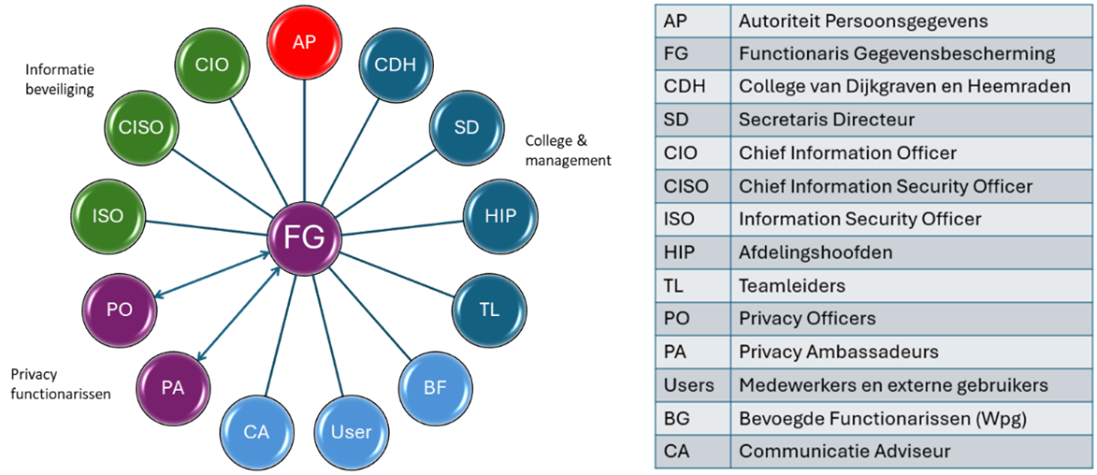 De Chief Information Security Officer (CISO) is verantwoordelijk voor het strategisch beleid rondom informatieveiligheid binnen de organisatie. De CISO bewaakt en stuurt de ontwikkeling, implementatie en naleving van informatiebeveiligingsbeleid, waarbij hij/zij de integriteit, beschikbaarheid en vertrouwelijkheid van informatie borgt. De CISO speelt een adviserende rol in het privacybeleid door ervoor te zorgen dat technische en organisatorische maatregelen voldoen aan wet- en regelgeving zoals de AVG en de BIO (Baseline Informatiebeveiliging Overheid). De CISO werkt nauw samen met de Functionaris Gegevensbescherming (FG) om te zorgen voor een integrale aanpak van privacy en informatieveiligheid.