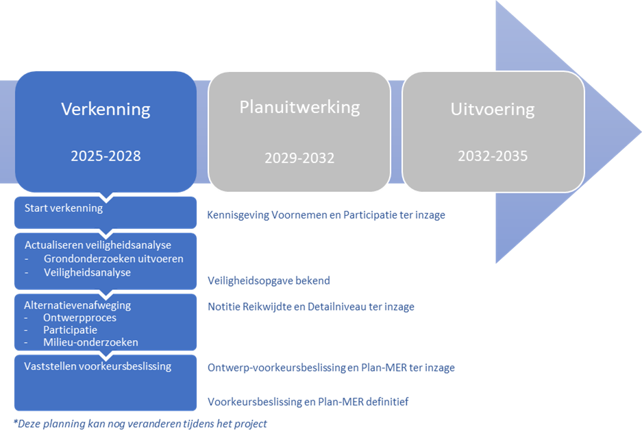 Momenteel zijn de eerste voorbereidingen in volle gang. In het najaar van 2024 werken we aan de aanbesteding van een adviesbureau dat begin volgend jaar begint met onderzoeken langs de dijk. Deze onderzoeken zullen mogelijk ook op private gronden worden uitgevoerd. Als dat het geval is, zullen we contact opnemen met de grondeigenaren en in gesprek gaan over deze onderzoeken. Onderzoeken die worden uitgevoerd zijn bijvoorbeeld sonderingen en grondboringen om de sterkte van de bodem te onderzoeken, en het plaatsen van peilbuizen waarmee de grondwaterstand wordt onderzocht.