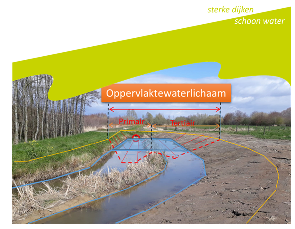 In onderstaande figuur ligt er naast de primaire watergang eenzijdig een strook secundair water.