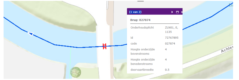Bij een brug worden de afmetingen en de onderhoudsplicht aangegeven.