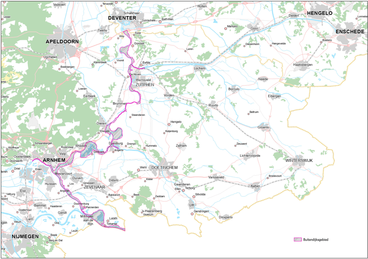buitendijks gelegen onroerende zaken: onroerende zaken die geheel of gedeeltelijk buiten de primaire waterkeringen, voor zover deze onroerende zaken niet tegen hoog buitenwater worden beschermd door een zomerkade of van nature aanwezig hoog land, zoals aangegeven op de kaart die bij de verordening behoort;