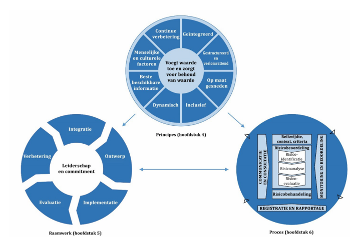 Het doel van risicomanagement is het creëren en beschermen van waarde. Het verbetert de prestaties, stimuleert innovatie en ondersteunt het bereiken van doelstellingen. De principes zoals geïllustreerd in figuur 2 geven richtlijnen over de kenmerken van doelmatig en doeltreffend risicomanagement, waardoor de waarde ervan wordt gecommuniceerd en de bedoeling en het doel worden uitgelegd. De principes vormen de basis voor het managen van risico’s en behoren in overweging te worden genomen bij het vaststellen van het raamwerk en de processen voor risicomanagement van de organisatie. Deze principes behoren een organisatie in staat te stellen de effecten van onzekerheid op haar doelstellingen te managen.