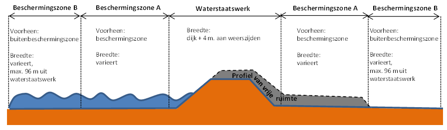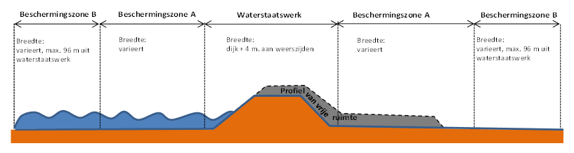 Het waterschap onderscheidt bij primaire en regionale waterkeringen vijf typen zones, waarvan er drie in onderstaande figuur weergegeven (naast zone B ligt een zone C voor windturbines).