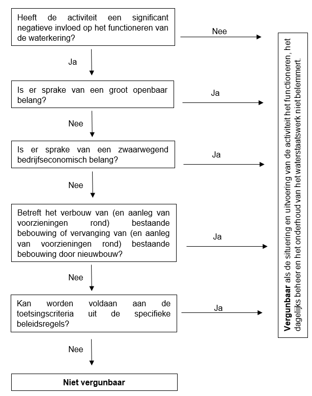Om te bepalen of voor activiteiten die niet gebonden zijn aan de waterkering, met bijbehorende beschermingszone en het profiel van vrije ruimte, vergunning verleend kan worden moet onderstaand stroomschema doorlopen worden.