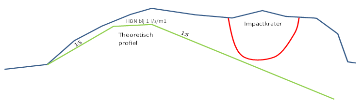 Ter illustratie: in de afbeelding is een in beginsel vergunbare casus weergegeven (waarbij het werkelijke profiel in blauw is aangegeven; HBN: Hydraulisch Belastingniveau):