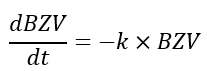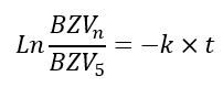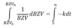 Stel dat de BZV5 het BZV is op het tijdstip t=0, dus bij het begin van de BZV19 bepaling. Het BZV op het tijdstip t=n dagen op BZV19. De toename van de BZV gedurende de tijd n is BZV19 - BZV5. De evenredigheidsconstante k is te vergelijken met een snelheidsconstante bij chemische reacties. De dimensie van k = tijd-1.