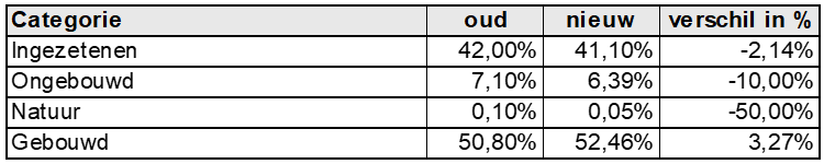Het aantal hectaren ongebouwd per 1000 inwoners, de ongebouwde dichtheid, is dus het gebiedskenmerk dat het rekenkundige kostenaandeel van de categorie bepaalt.