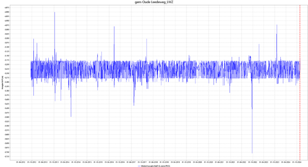 Figuur 3 meetreeks gemeten waterpeilen meetpunt Oude Leedeweg (bij het gemaal)
