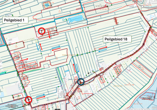 Figuur 4 – Kaart met de praktijksituatie van de waterhuishouding – blauwe cirkel: gemaal Oude Leede, rode cirkels: inlaten, blauwe pijlen: afvoerrichting water, rode pijlen: aanvoerrichting water