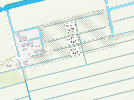 In het noorden van peilgebied 27 zijn drie kleine gebieden met een afwijkend waterpeil (zie Figuur 4 en Figuur 5). De waterpeilen in deze gebieden zijn: