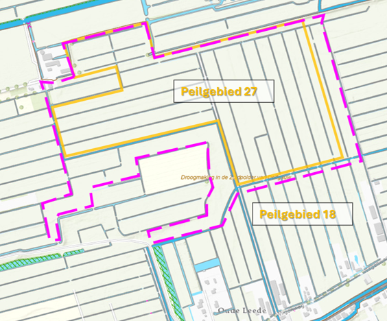 Figuur 7 begrenzing nieuwe peilgebied 27 (oranje lijn) en oude peilgebied (paarse stippellijn)
