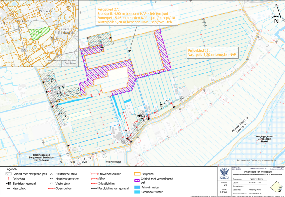 In 2011 zijn de waterpeilen de hele Zuidpolder van Delfgauw vastgesteld4. In peilgebied 18 is toen een vast waterpeil van 5,20 m beneden NAP vastgesteld.