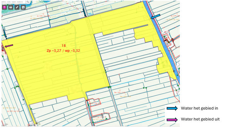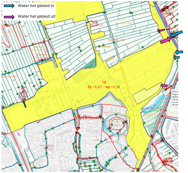 We laten zien hoe het watersysteem in elkaar zit en hoe het werkt. Dit is belangrijk omdat door het watersysteem bepaalde waterpeilen soms niet mogelijk zijn. In figuren 10, 11 en 12 zijn kaartjes van het watersysteem in peilgebied 16, 18 Noord en 18 Zuid. Hierop staat aangegeven waar het water het peilgebied in en uit kan. Het water wordt vanuit de boezem peilgebieden 16 en 18 in gelaten.