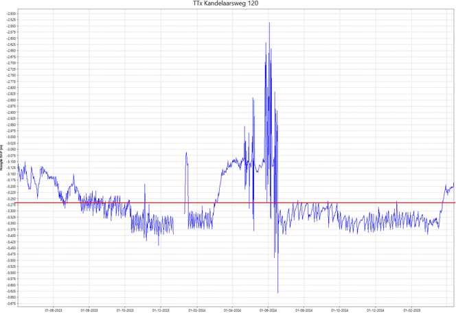 Figuur 13 Meetlocatie Kandelaarweg 120 (peilgebied 17), rode lijn op -3,27 m NAP