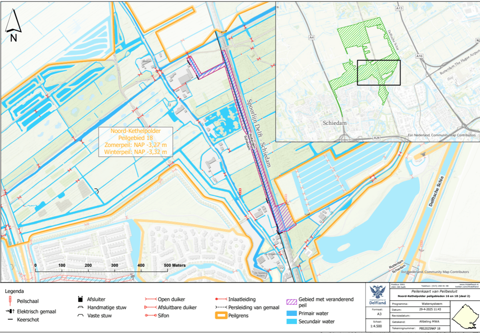 Langs De Schie in peilgebied 16 ligt een regionale kering (zie figuur 2). In figuur 5 is te zien dat in peilgebied 18 in noordelijke richting, langs het Octave De Coninckpad, een polderkade (oranje) ligt. Een andere polderkade vormt de zuidgrens van peilgebied 18. Deze loopt grofweg tussen rijksweg A4 en De Schie, via de Poldervaart. Langs De Schie ligt de regionale kering (groen). Omdat het peil niet verandert is er geen risico op onstabieler worden van de kades.