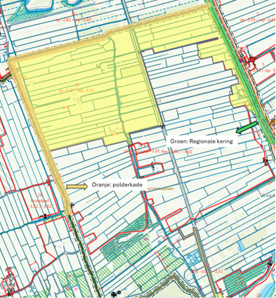 Figuur 5 Ligging regionale kering (groen) en polderkades (oranje)