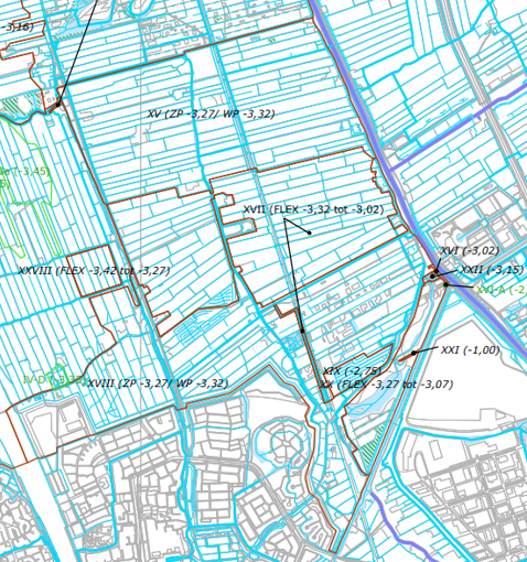 Voor peilgebied 16 is toen een vast waterpeil vastgesteld op 3,02 m beneden NAP. Dit peil is te laag en kan niet kloppen als hoogwatervoorziening. Voor de watergang langs het spoor, die onderdeel was van peilgebied 17, is toen een flexibel waterpeil met een maximum van 3,02 meter beneden NAP en een minimum van 3,32 meter beneden NAP vastgesteld. Voor peilgebied 18 is toen een waterpeil van 3,27 m beneden NAP in de zomer en 3,32 m beneden NAP in de winter vastgesteld.