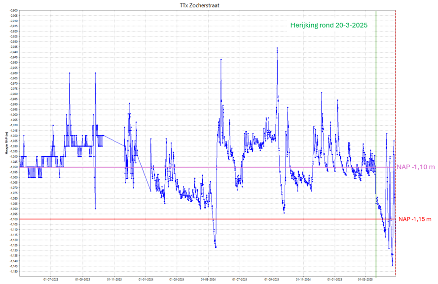 In maart 2025 zijn deze meetpunten gecontroleerd. Uit deze controlemeting blijkt dat de waterstand 5 cm lager is dan gedacht. De waterstand blijkt dus op 1,10 meter beneden NAP te staan in plaats van 1,05 meter beneden NAP. De getallen op de schaal aan de linkerkant van figuur 4 zijn dus 5 centimeter te hoog aangegeven.